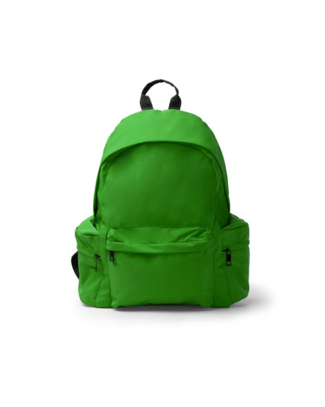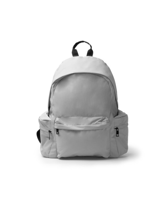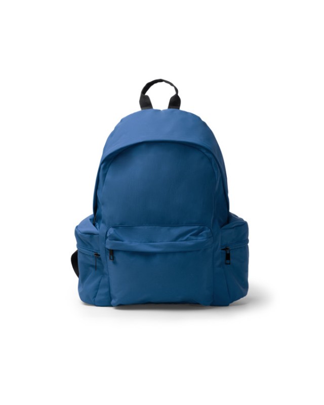 Zaino in nylon riciclato 420D. Presenta uno scomparto principale con tasca interna per laptop fino a 15". Include due doppie tasche laterali con apertura superiore e chiusura a zip per riporre gli oggetti più piccoli. Presenta inoltre una tasca frontale con chiusura a zip. Schienale e manici imbottiti per un maggiore comfort. - Composizione: Nylon riciclato 420D - Misure: 37cm/41cm/13cm