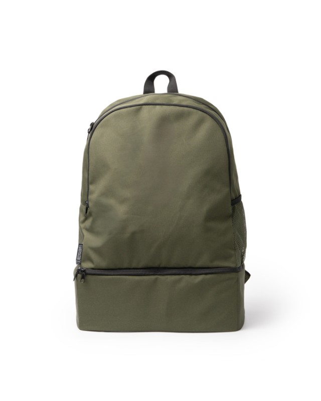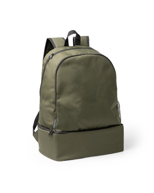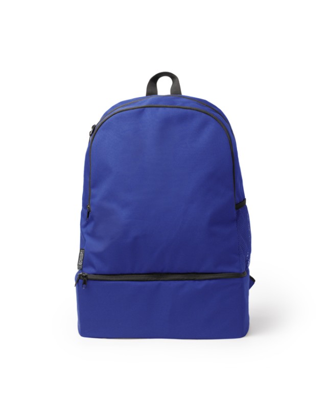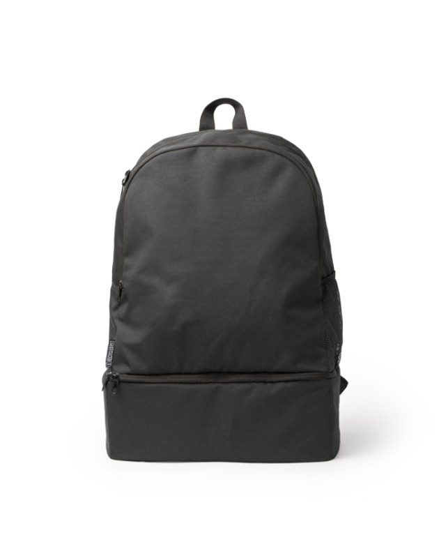Zaino sportivo in RPET 600D. Presenta uno scomparto principale con chiusura a zip e un'ampia tasca frontale. Ha una tasca laterale in mesh con elastico regolabile per trasportare le bottiglie. Sul fondo include uno scomparto rigido per le scarpe che consente di separarle dal resto dello zaino. Lo schienale e le bretelle sono imbottiti e lo rendono più facile da usare. - Composizione: RPET 600D - Misure: 33cm/50cm/24cm