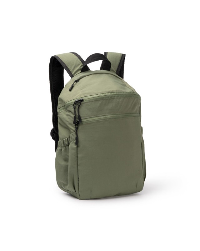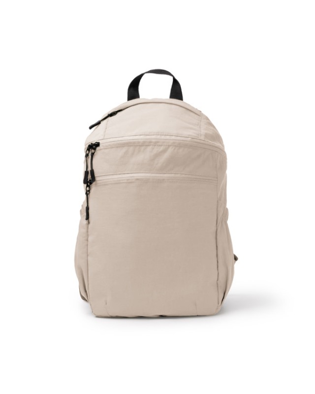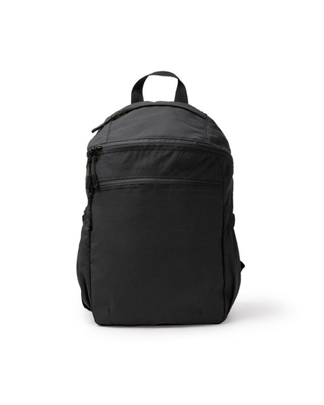 Zaino in nylon Taslon Ripstop con tasche laterali provviste di elastico regolabile per trasportare le bottiglie. Presenta una tasca frontale con chiusura a zip e una tasca più piccola sulla parte superiore. All'interno c'è una tasca imbottita per il trasporto di dispositivi elettronici come i tablet fino a 10". Schienale e manici imbottiti per un maggiore comfort. - Composizione: Nylon Taslon Ripstop - Misure: 26cm/38cm/13cm