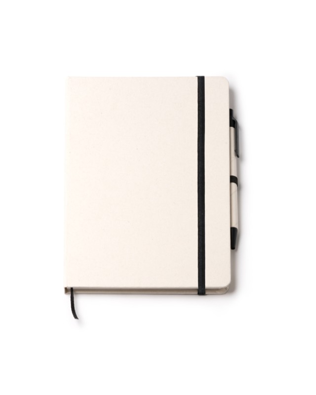 Quaderno A5 realizzato con cartoni del latte riciclati. Copertine rigide con elastico e segnapagina. Penna a sfera a inchiostro blu inclusa. 100 fogli bianchi. - Composizione: Cartone riciclato dai cartoni del latte. - Misure: 14,5cm/21cm/1,3cm