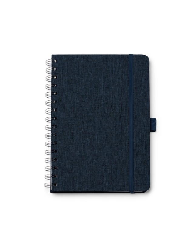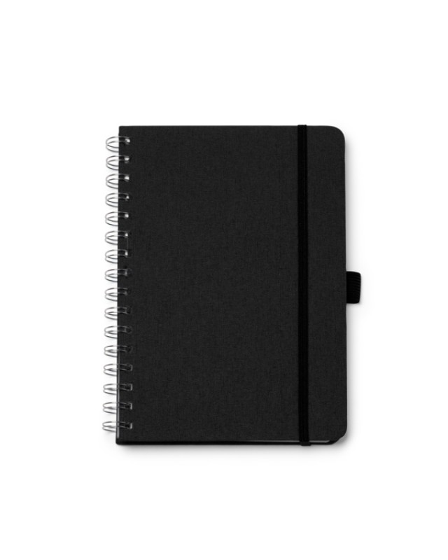 Quaderno A5 con copertina rigida in tessuto poliestere riciclato RPET e doppia spirale. Include un elastico di chiusura e un portapenne in tinta con la copertina. Contiene 80 fogli foderati, perfetti per appunti organizzati ed ecologici. - Composizione: Poliestere riciclato RPET - Misure: 14cm/21cm/1,5cm