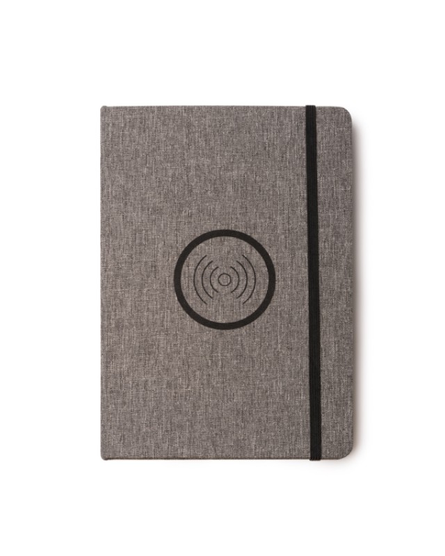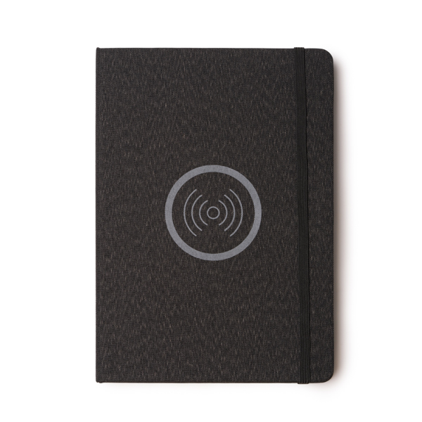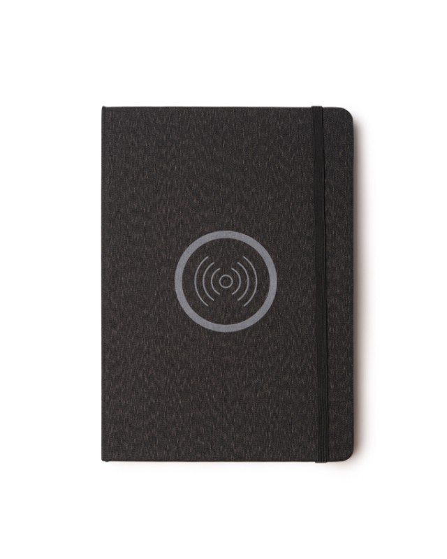 Blocco note A5 realizzato in tessuto RPET con superficie di ricarica wireless da 15 W per dispositivi mobili. È dotato di porta Type-C per la ricarica e chiusura con elastico. - Composizione: RPET - Misure: 14,8cm/21cm/1,5cm