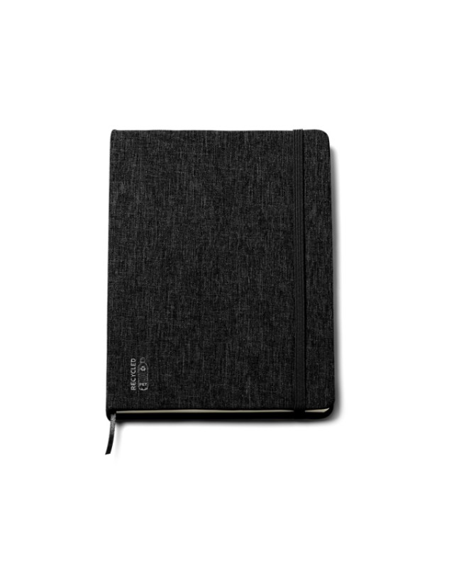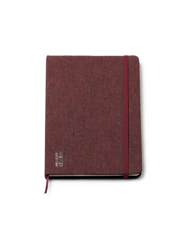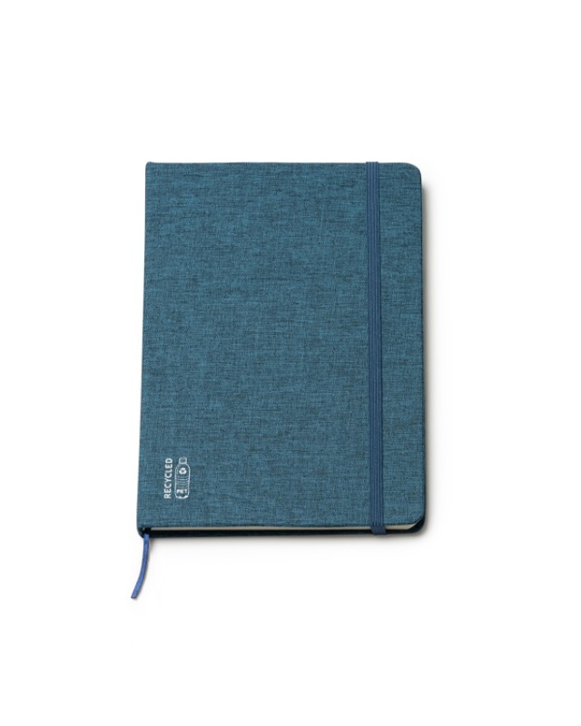 Quaderno A5 con copertina rigida in RPET. Segnalibro ed elastico abbinati. 80 fogli. - Composizione: RPET - Misure: 14,7cm/21cm/1,5cm