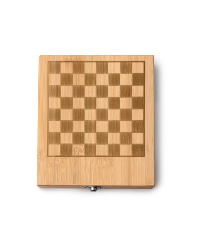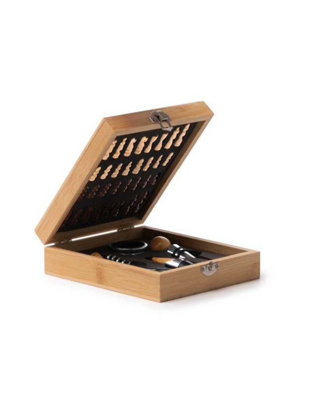 Set per vino presentato in una scatola di bambù decorata con una scacchiera. Il set include 4 accessori: cavatappi con apribottiglie, dispenser, tappo e anello salvagoccia per la bottiglia, tutti realizzati in acciaio inossidabile con dettagli in bambù. Include pezzi degli scacchi. - Composizione: Acciaio inox e bambù - Misure: 14,8cm/5cm/16,5cm