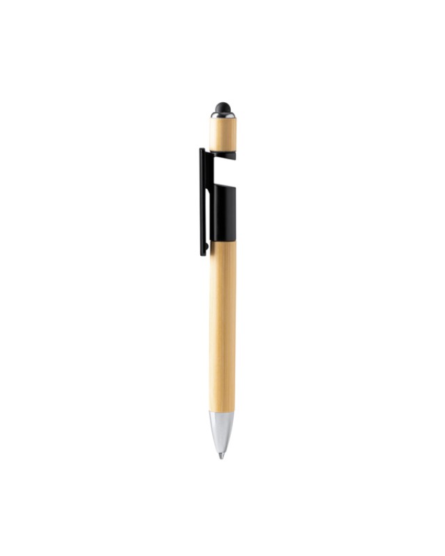 Penna a sfera con funzione spinner antistress. Corpo in bambù e supporto per smartphone. Puntatore touch e finitura metallica. Inchiostro blu. - Composizione: Bambù - Misure: 16cm/1,2Ø