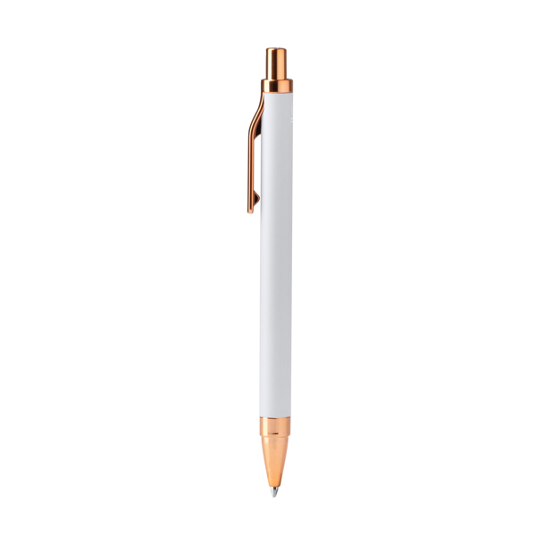 Penna in alluminio riciclato con finitura opaca liscia e dettagli color rame. È dotata di una ricarica di inchiostro blu jumbo, che offre una scrittura fluida e una durata prolungata. - Composizione: Alluminio riciclato - Misure: 14cm/1Ø