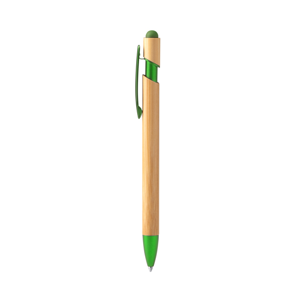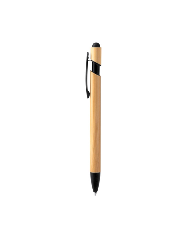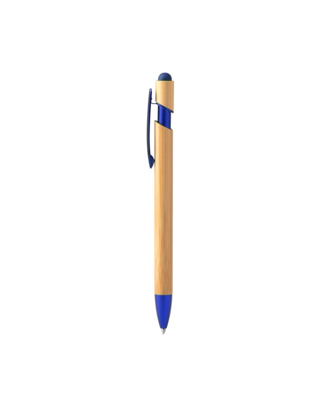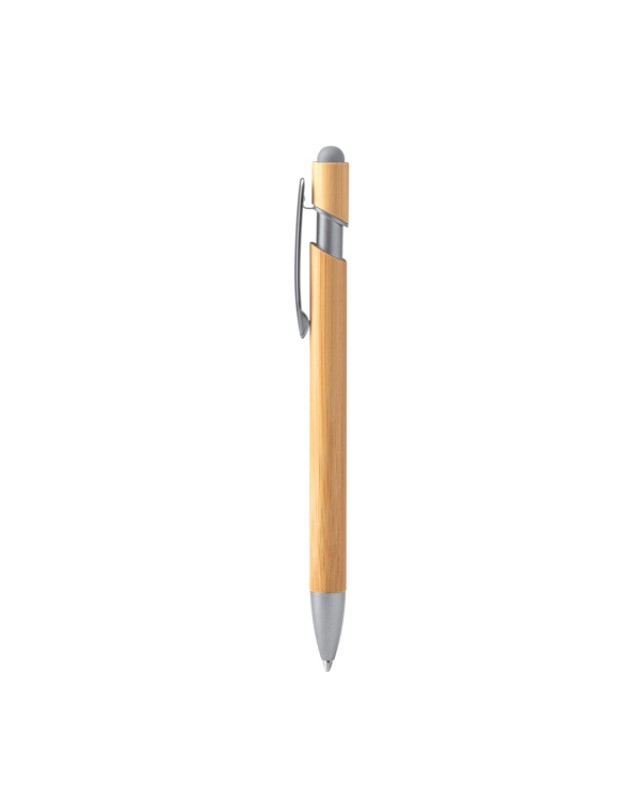 Penna a sfera con corpo e pulsante in bambù. Dettagli effetto cromato e stilo touch screen coordinato. È dotata di una ricarica di inchiostro blu jumbo, che offre una scrittura fluida e una durata prolungata. - Composizione: Bambù - Misure: 14,5cm/1Ø