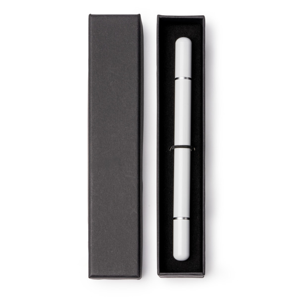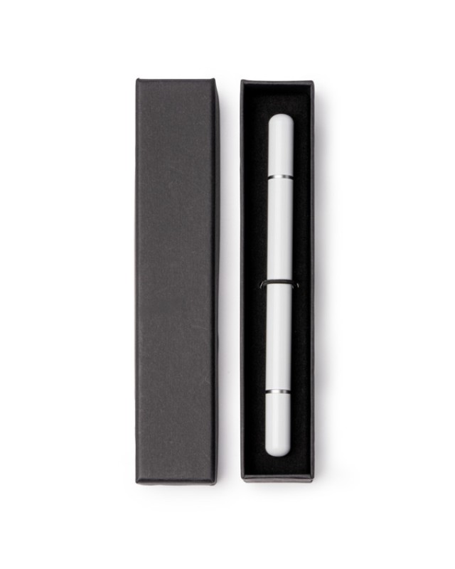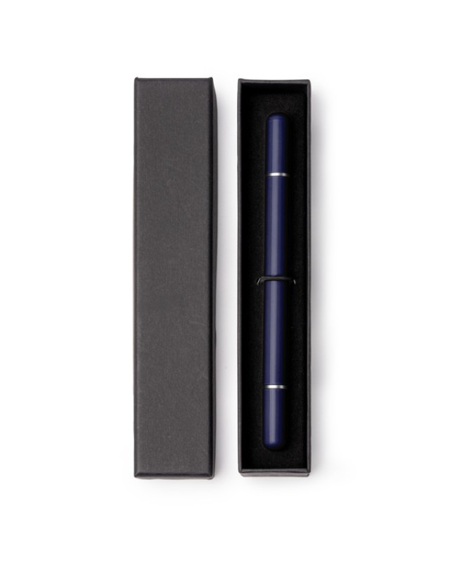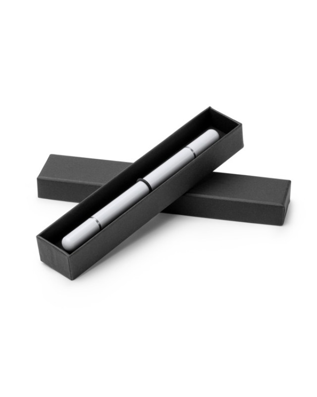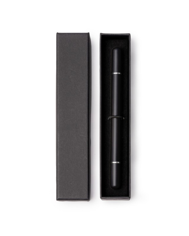 Penna e matita infinita 2 in 1 con corpo in metallo. A un'estremità presenta una penna con ricarica jumbo a inchiostro blu e all'altra estremità una matita infinita, entrambe con cappuccio. Confezione individuale in custodia singola nera con interno imbottito. - Composizione: Metallo - Misure: 13,5cm/1Ø