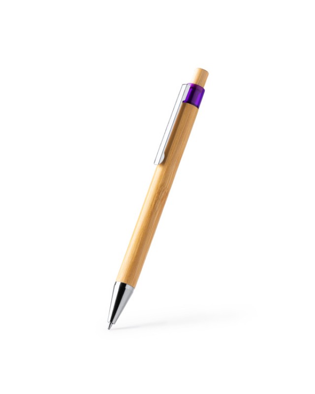 Penna a sfera con corpo e pulsante in bambù. Dispone di clip e punta con finitura in metallo, insieme a dettagli traslucidi colorati. Inchiostro blu. - Composizione: BAMBÙ - Misure: 14cm/0,9Ø