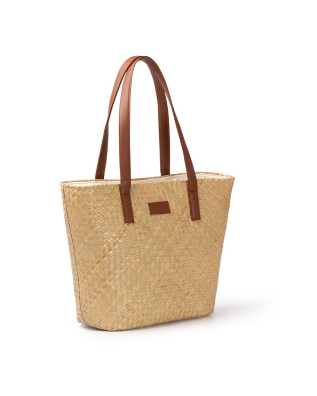 Borsa con esterno in paglia e fodera interna in cotone. Presenta un ampio scomparto principale con chiusura a zip e lunghi manici in pelle PU, entrambi in finitura coordinata. Include una tasca interna per trasportare piccoli oggetti e una zona anteriore ideale per il branding. - Composizione: Paglia, cotone e pelle PU - Misure: 54cm/36cm/15cm
