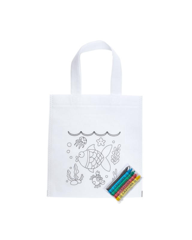 Borsa per bambini in TNT con disegno da colorare. Include 5 pastelli a cera di vari colori. - Composizione: Tessuto non-tessuto - Misure: 20,5cm/22cm