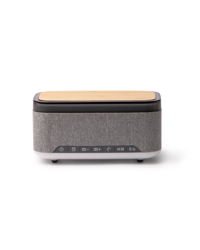 Altoparlante wireless con corpo in bambù e tessuto RPET riciclato. Include diverse funzioni: sveglia, lampada e orologio, quest'ultimo visualizzato sulla parte anteriore. Include diverse modalità di illuminazione lungo il perimetro. Include anche una base di ricarica wireless da 10 W per smartphone. Le diverse modalità di riproduzione includono connessione Bluetooth, suoni rilassanti e modalità radio FM. Dispone inoltre di porte Type-C, USB, ingressi audio ausiliari e uno slot per schede di memoria. - Composizione: RPET e bambù - Misure: 18cm/9cm/10cm