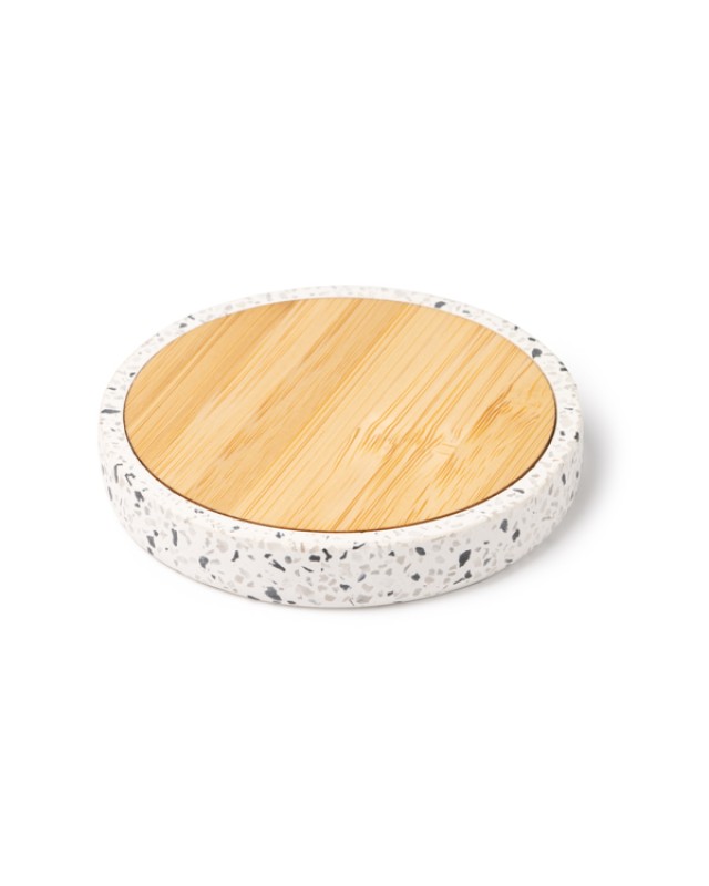 Caricabatterie wireless con corpo in pietra terrazzo riciclata e bambù. Ricarica wireless da 10W Cavo di tipo C incluso. Confezione in scatola con design ecologico. - Composizione: Pietra terrazzo riciclata e bambù. - Misure: 1cm/7,5Ø