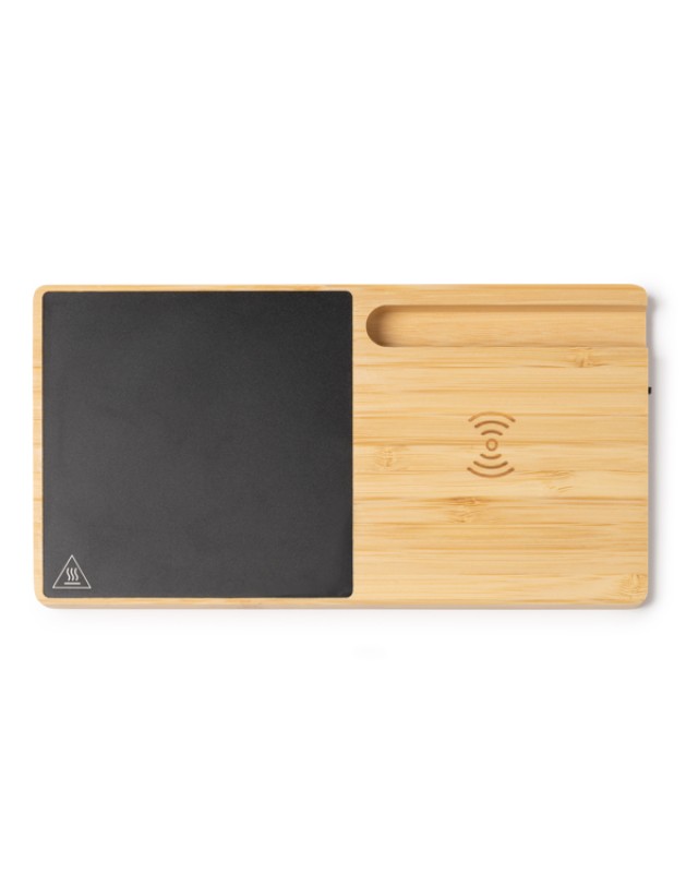 Riscaldatore per tazze in bambù con vassoio di ricarica rapida wireless da 15 W e supporto per smartphone. Cavo di tipo C incluso. Confezione in scatola con design ecologico. - Composizione: Bambù - Misure: 18,2cm/1,4cm/9,5cm