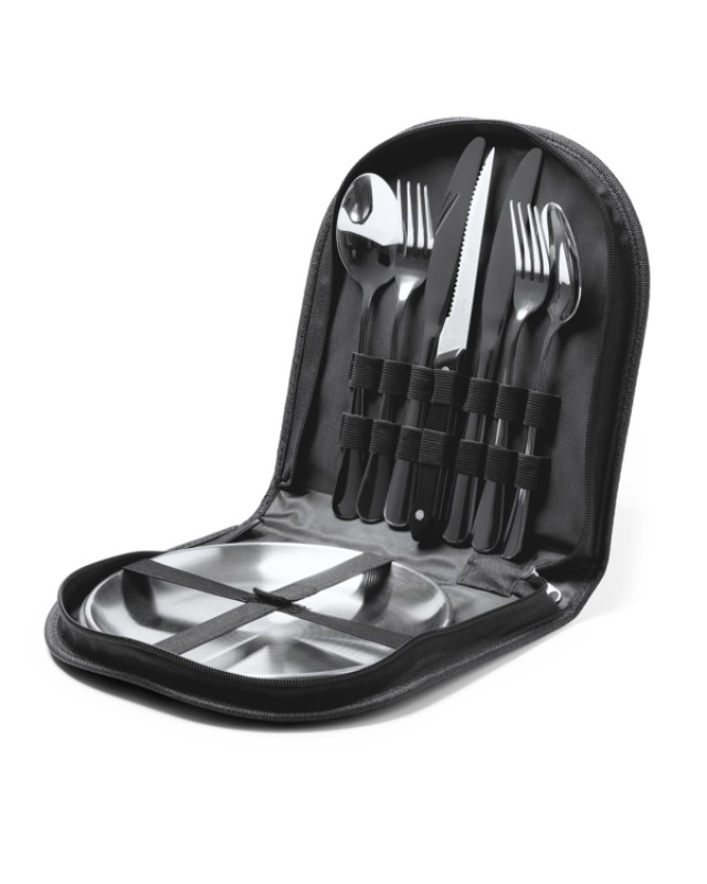 Set di posate e piatti in acciaio inox. Accessori: 2 cucchiai, 2 forchette, 2 coltelli, coltello a sega e 2 piatti. Custodia in RPET per il trasporto con chiusura a cerniera. - Composizione: Acciaio inox e RPET - Misure: 24cm/24cm/4cm