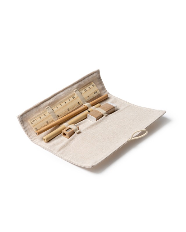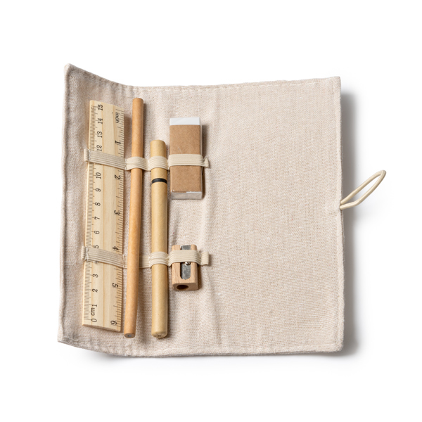 Set da scrittura con righello in bambù, matita in carta, penna in cartone, temperamatite in legno e gomma. Confezione in juta e cotone. - Composizione: Bambù e cartone - Misure: 19cm/19cm