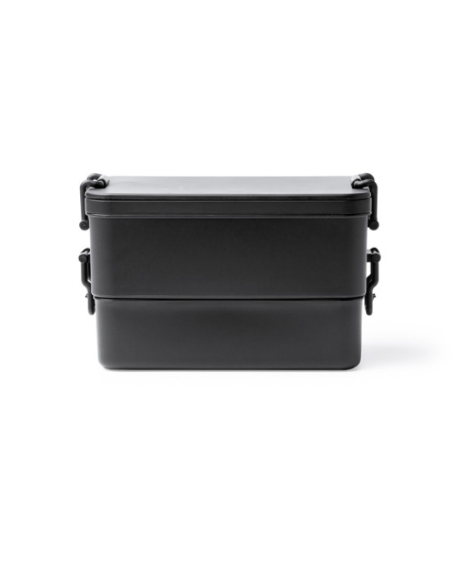 Portapranzo in PP con capacità 2,3 L. Dispone di due scomparti indipendenti impilabili di diverse dimensioni, che possono essere posizionati uno sopra l'altro o riposti uno dentro l'altro. Entrambi gli scomparti hanno una chiusura di sicurezza con fibbie laterali e il coperchio include un set di posate che sono tenute ferme grazie a un supporto a clip. Opzione completa e versatile per il trasporto di alimenti senza doverli mischiare. - Composizione: PP - Misure: 20cm/12,5cm/12cm