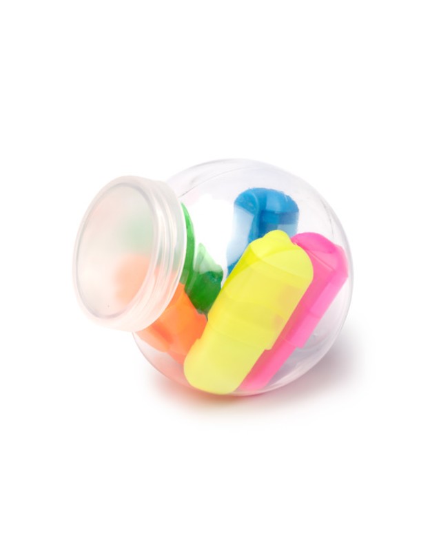 Set di pennarelli multicolore presentato in un contenitore tondo in PP trasparente. Tappo traslucido con una superficie appositamente progettata per il branding. Include cinque colori diversi. - Composizione: PP - Misure: 7,4cm/7,8cm/5,7cm