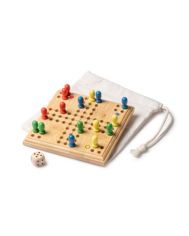 Set di parcheesi in bambù. Include tavola, uno stampo e 16 tessere in 4 colori. Include una fodera in cotone. Confezione in scatola con design ecologico - Composizione: Bambù - Misure: 14cm/16cm/3cm