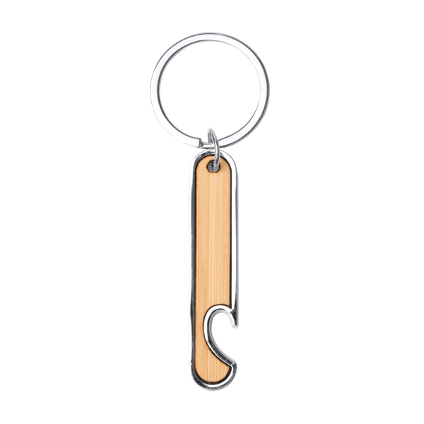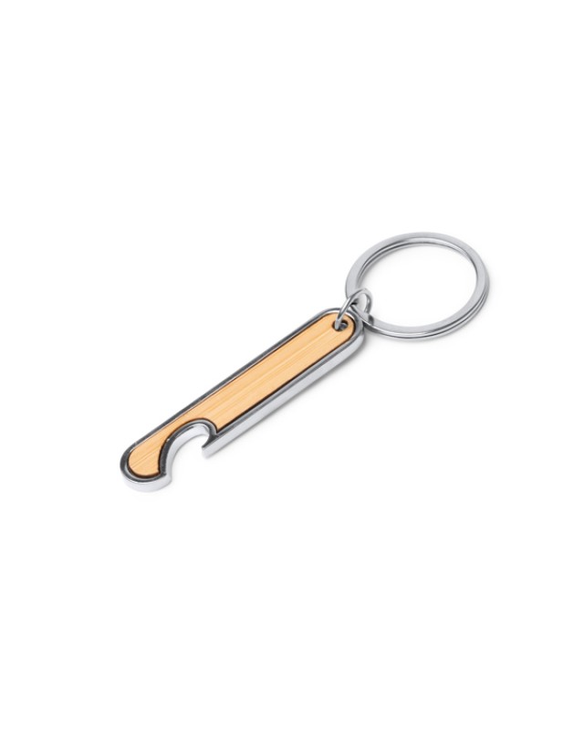 Portachiavi apribottiglie realizzato in acciaio con corpo in bambù. - Composizione: Acciaio e bambù - Misure: 9,1cm/0,3cm/3cm