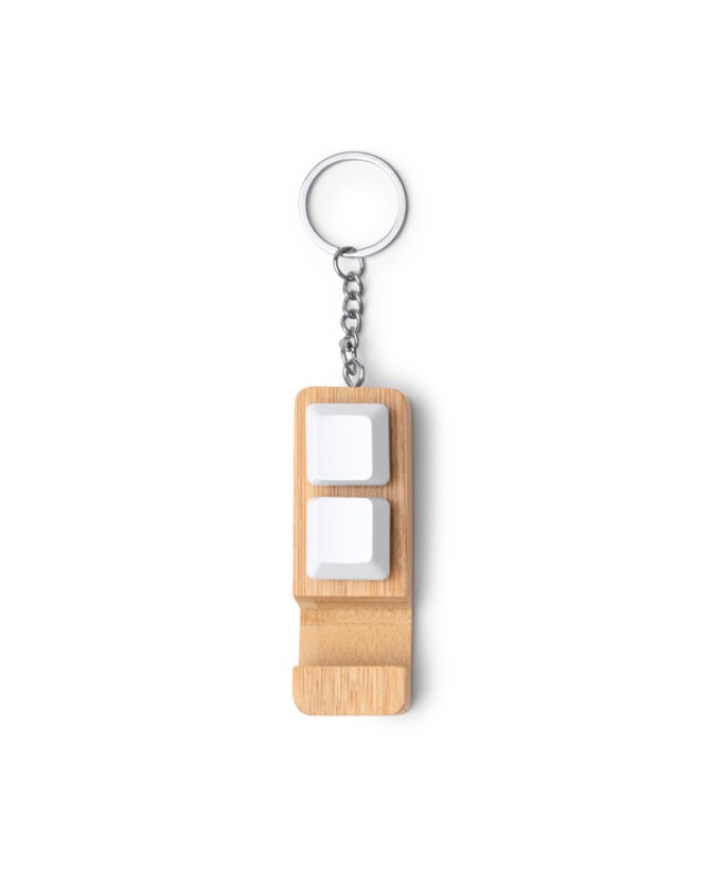 Portachiavi in bambù con supporto per smartphone e funzione antistress. Il design presenta tasti bianchi che possono essere premuti e utilizzati come antistress. - Composizione: Bambù - Misure: 2,4cm/1,7cm/7cm
