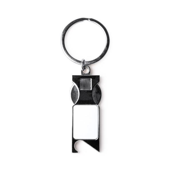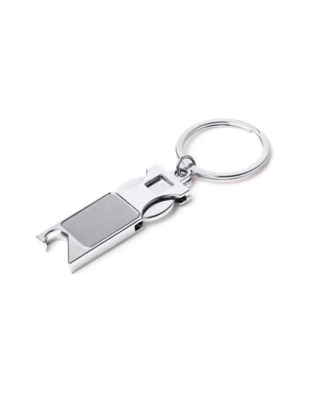 Portachiavi in metallo con moneta rimovibile per il carrello. La moneta può essere completamente rimossa e inserita in uno spazio progettato a tale scopo. Presenta un apribottiglie a un'estremità. - Composizione: Metallo - Misure: 2,1cm/9,7cm/0,5cm