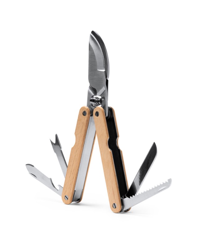 Utensili multiuso in acciaio inox e manico in legno. 6 funzioni: forbici, rasoio, sega, lima, cacciavite e apribottiglie. - Composizione: Acciaio inox e bambù - Misure: 20cm/2cm/8,5cm