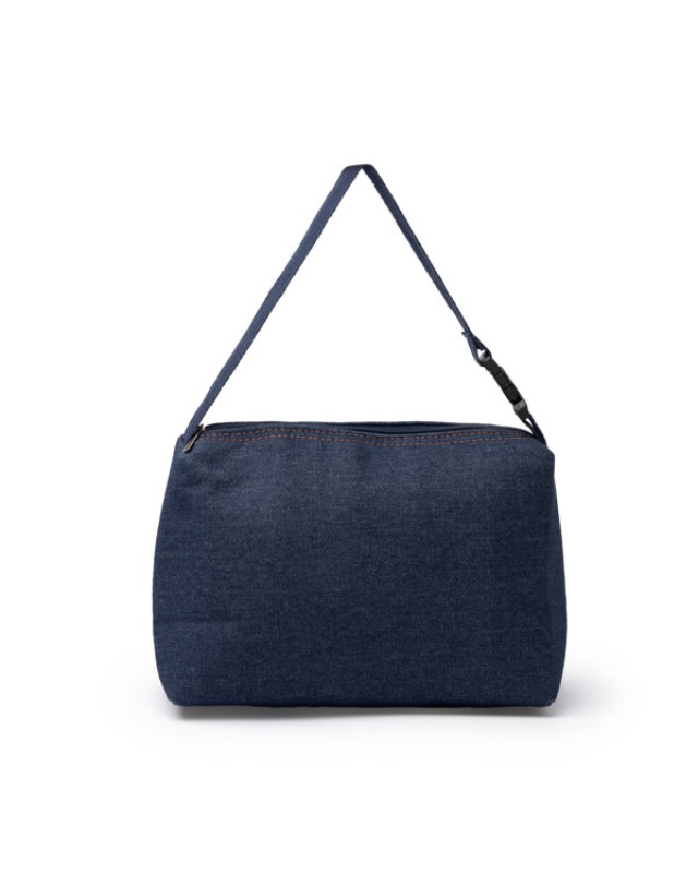 Borsa termica in tessuto denim riciclato con interno isolante per mantenere gli alimenti a una temperatura ottimale. Chiusura a zip in tinta e tiralampo in metallo. Dispone di un manico con fibbia per essere trasportata in modo versatile. - Composizione: Denim riciclato - Misure: 26cm/18cm/13cm