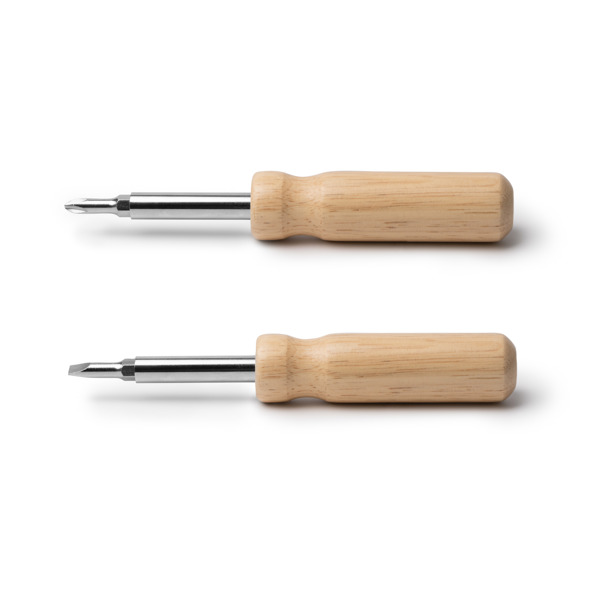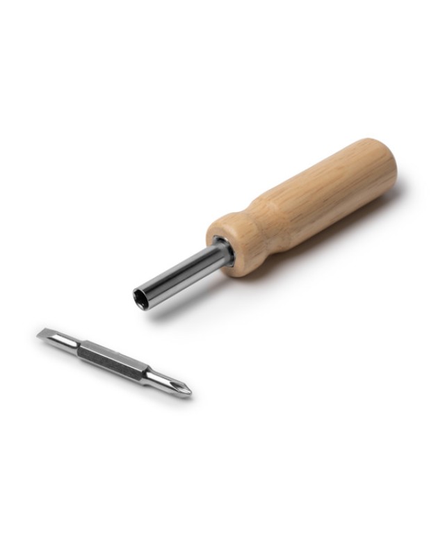 Cacciavite in acciaio inossidabile con manico tondo in legno. Dispone di diverse punte intercambiabili facili da montare. Punta a croce e a taglio, ciascuna in due dimensioni diverse. - Composizione: Acciaio inox e legno - Misure: 17,5cm/2,7Ø