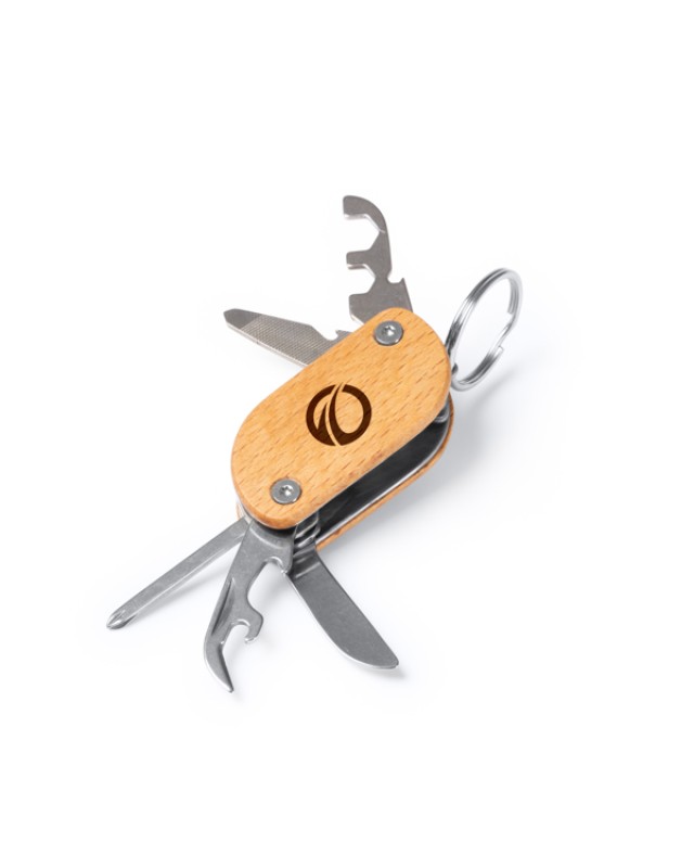 Utensili multifunzione con corpo in legno e accessori in acciaio inox. Cinque funzioni: lima, rasoio, apribottiglie, apriscatole e cacciavite. - Misure: 6cm/2cm