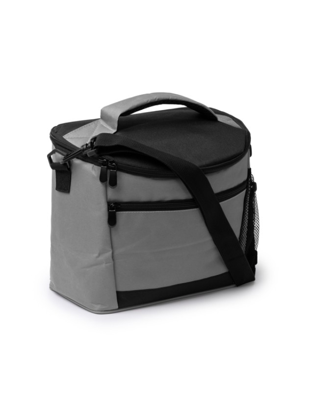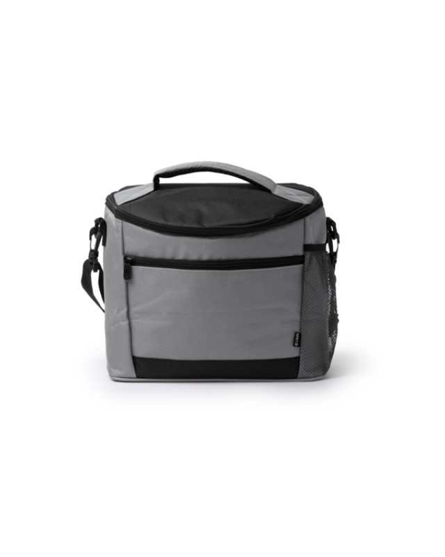 Borsa grande in materiale isolante in RPET 600D. Tasca frontale e tasca laterale con chiusura a zip. Interno isotermico. Tracolla regolabile. Capacità: 8L - Composizione: RPET - Misure: 30cm/24cm/19cm