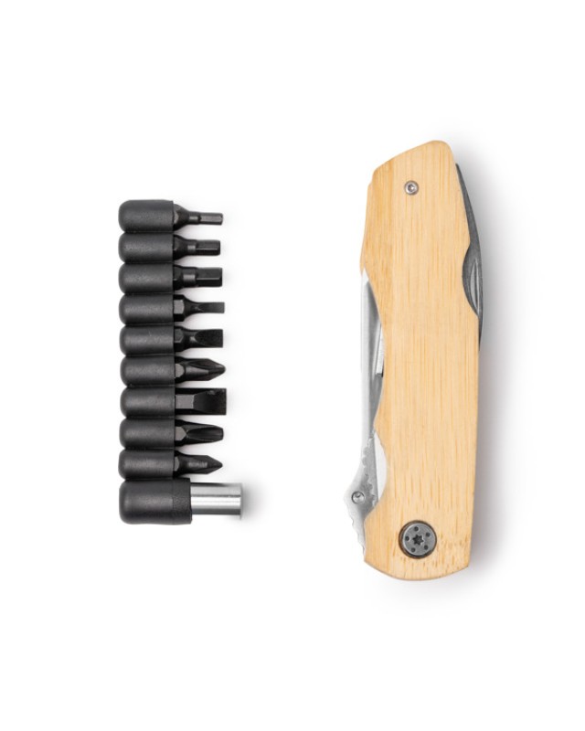 Utensile multifunzione 5 in 1 in acciaio inossidabile con corpo in bambù. Include cacciavite con nove punte intercambiabili, cacciavite a taglio fisso, pinze, coltellino, seghetto, apribottiglie e apriscatole. Gli utensili possono essere ripiegati all'interno del corpo in bambù, rendendo l'oggetto compatto. È inoltre provvisto di un blocco di sicurezza. - Composizione: Acciaio inox e bambù - Misure: 11cm/3cm/2,5cm
