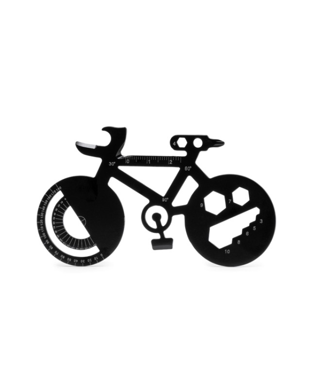 Utensili multiuso in acciaio inox a forma di bicicletta. 11 funzioni: apriscatole, trasportatore angolare, cacciaviti, chiave inglese e righelli. - Composizione: Acciaio inox - Misure: 10,7cm/0,2cm/6,2cm