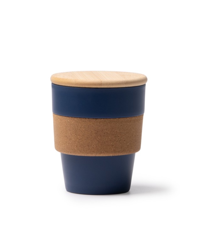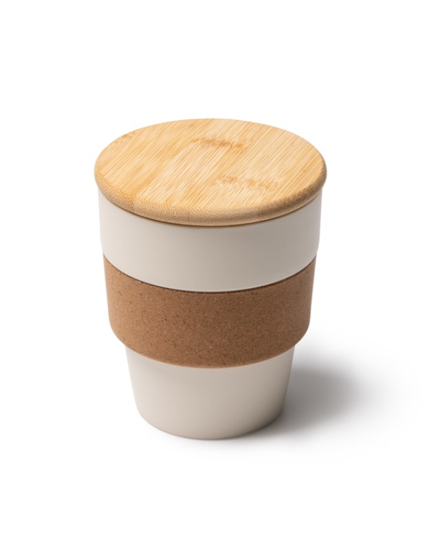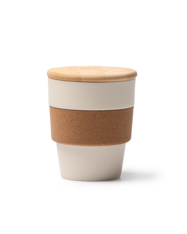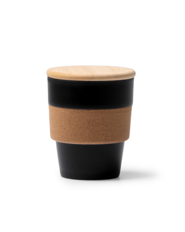Tazza in PP riciclata, fascia in sughero e coperchio in bambù. Capacità: 350 ml. Confezione in scatola con design ecologico. - Composizione: PP riciclato, sughero e bambù. - Misure: 10,5cm/9Ø