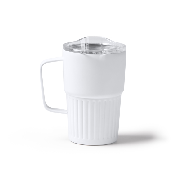 Tazza termica in acciaio inox 304 riciclato con design smussato a doppia parete. Coperchio di sicurezza trasparente. Capacità: 450 ml. Confezione in scatola con design ecologico. - Composizione: Acciaio inox riciclato - Misure: 14cm/8,9Ø