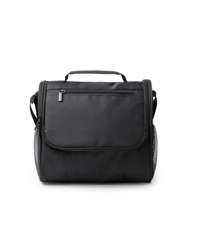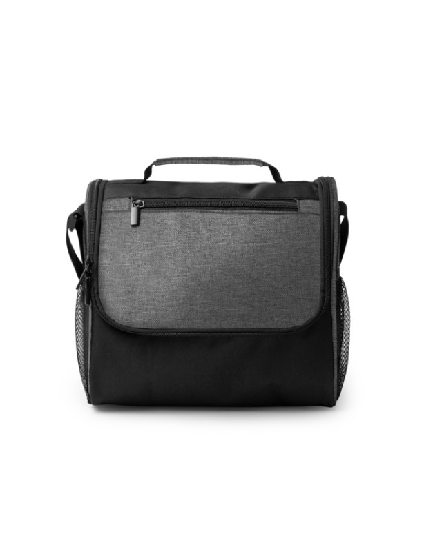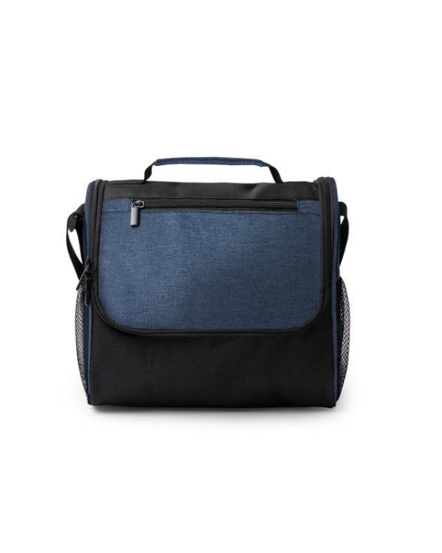 Borsa in RPET 600D isolante. Tasca principale con interno isotermico. Doppia tasca frontale con chiusura a zip e 2 tasche laterali. Tracolla regolabile. - Composizione: RPET - Misure: 25cm/23cm/14cm