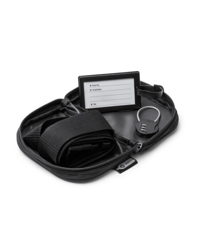 Set da viaggio 3 in 1. Include lucchetto con password numerica a tre cifre, card identificativa in PP e cinghia regolabile per una maggiore sicurezza. Tutti questi accessori sono presentati in una custodia in RPET con chiusura a zip a tutta apertura. - Composizione: RPET, PU, PP, ABS - Misure: 17,5cm/12cm/4cm
