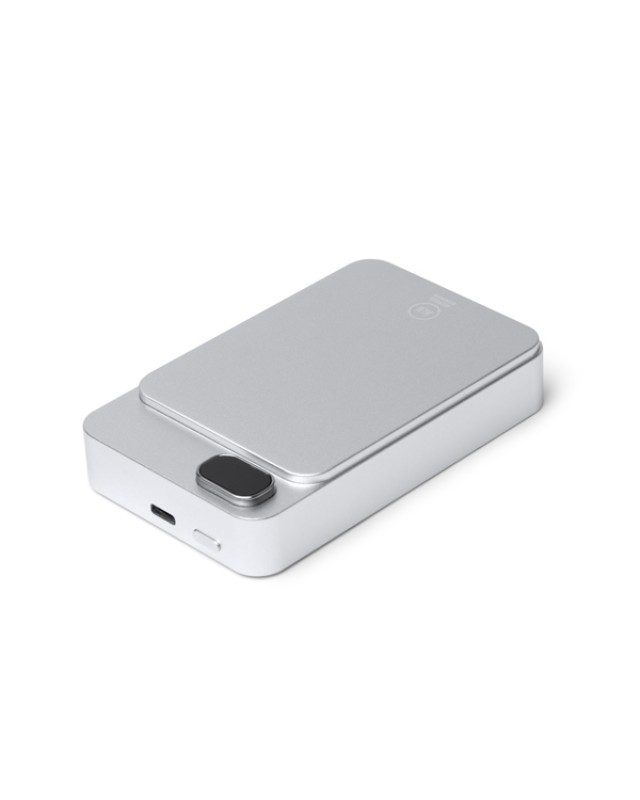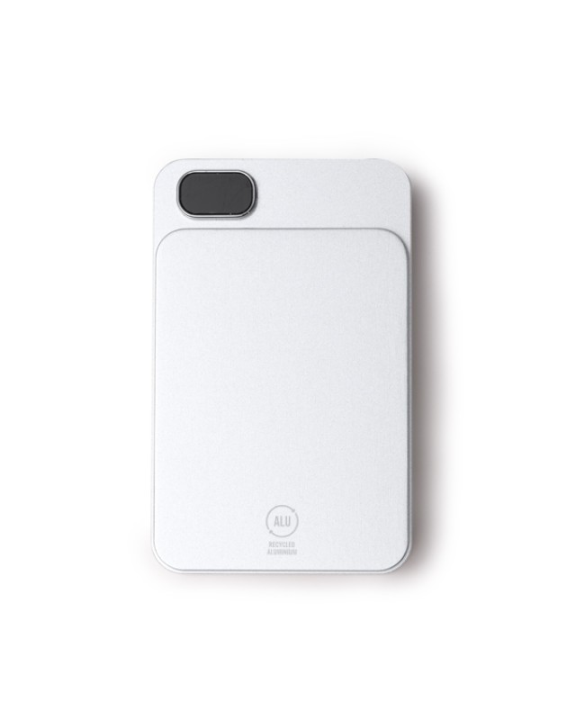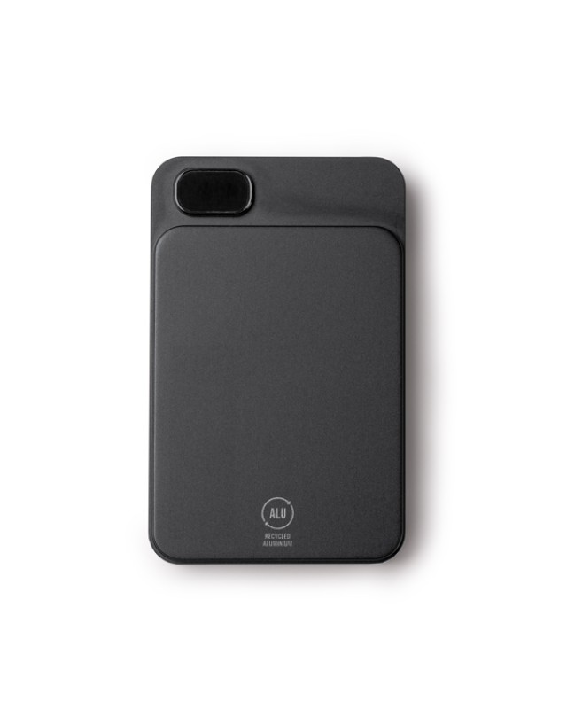 Batteria magnetica esterna da 10000 mAh con funzione di ricarica wireless. Schermata per visualizzare la percentuale di ricarica. Corpo in alluminio riciclato. Corrente d’uscita 15W. Include cavo di tipo C e anello magnetico. Confezione in scatola con design ecologico. - Composizione: Alluminio riciclato - Misure: 6,4cm/10,3cm/1,9cm
