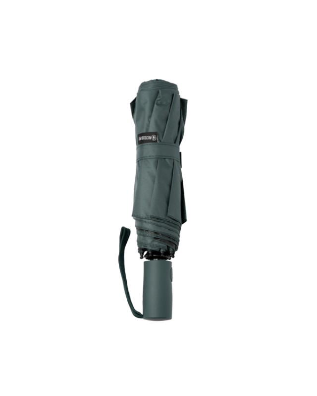 Ombrello pieghevole realizzato in RPET con protezione contro i raggi ultravioletti. Apertura e chiusura automatica. Tessuto pongee 190T con protezione UV SPF50. Stecche in fibra di vetro con protezione contro i temporali. Chiusura in velcro. Include una fodera abbinata. - Composizione: RPET - Misure: 55cm/95Ø