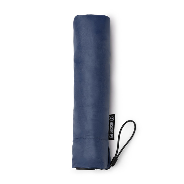 Ombrello pieghevole mini leggero in RPET con apertura manuale e tessuto pongee 190T. Le stecche in fibra di vetro e il fusto centrale in alluminio conferiscono rigidità al telaio e lo rendono antivento. Include protezione dai raggi ultravioletti UPF50 con rivestimento trasparente. Il sistema pieghevole lo rende un ombrello compatto che può essere riposto ovunque. Dispone di un manico nero per il trasporto e di un fodero abbinato. - Composizione: RPET - Misure: 50cm/90Ø