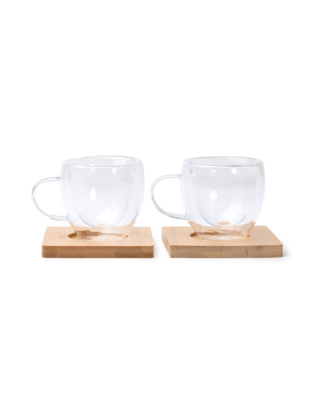Set da caffè composto da due tazze in vetro a doppia parete e due sottobicchieri quadrati in bambù. La doppia parete della tazza garantisce isolamento termico, rendendola più comoda da usare. Ogni tazza ha una capacità di 90 ml. - Composizione: Vetro borosilicatoBambù - Misure: 9cm/6,5cm/9cm