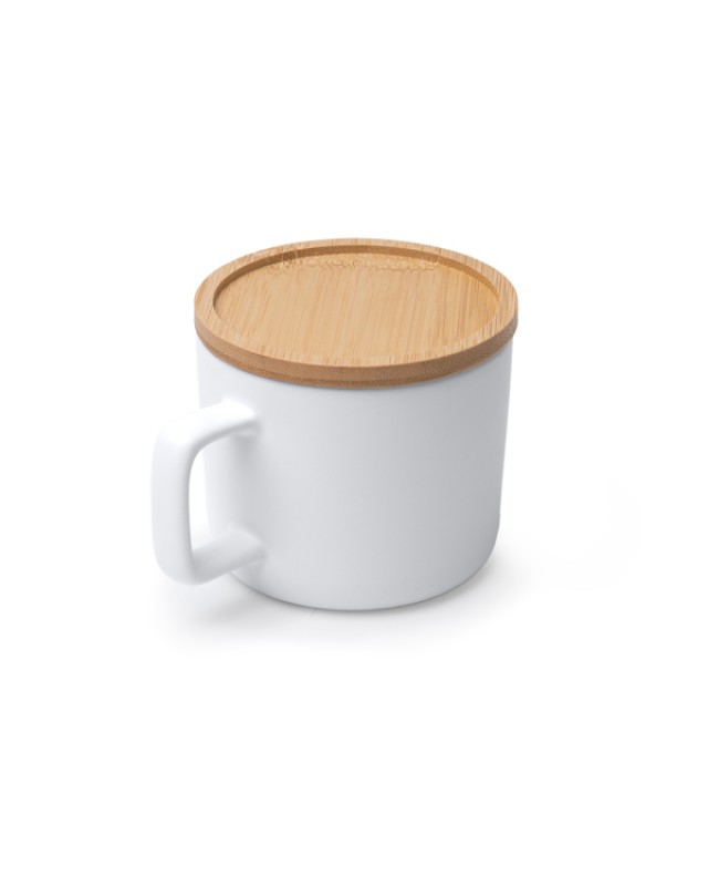 Tazza in ceramica con finitura esterna opaca e manico quadrato. Capacità 350 ml, include un coperchio in bambù che funge anche da sottobicchiere, aggiungendo ulteriore versatilità. L'interno presenta una finitura lucida per una maggiore resistenza e durata. Progettata appositamente per la sublimazione. - Composizione: CeramicaBambù - Misure: 8,4cm/10,5Ø
