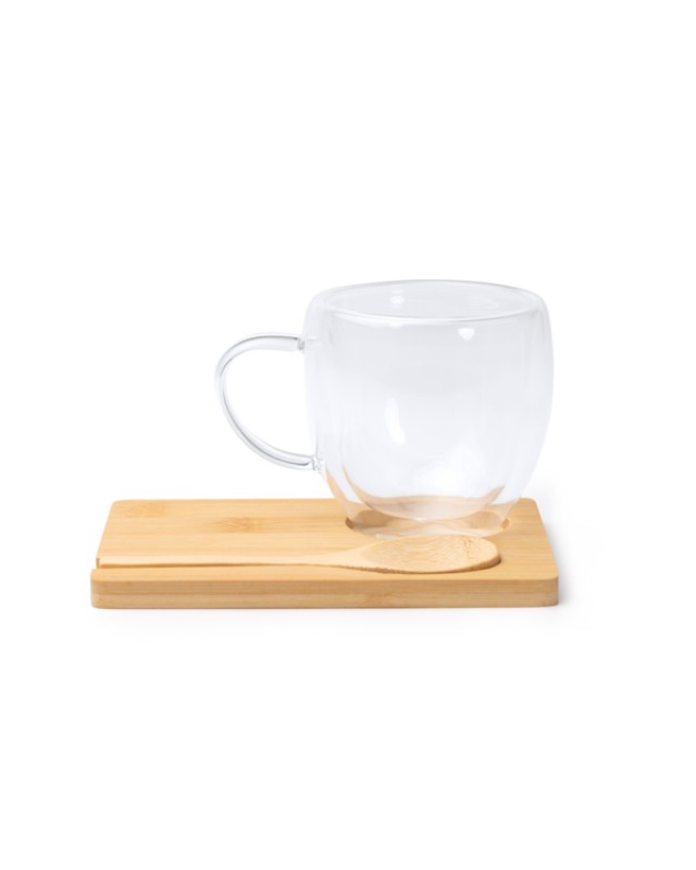 Set composto da tazza in vetro borosilicato a doppia parete, sottobicchiere rettangolare e cucchiaio in bambù. La doppia parete della tazza garantisce isolamento termico, rendendola più comoda da usare. Capacità fino a 250 ml. - Composizione: Vetro borosilicato Bambù - Misure: 16cm/8,6cm/11,5cm
