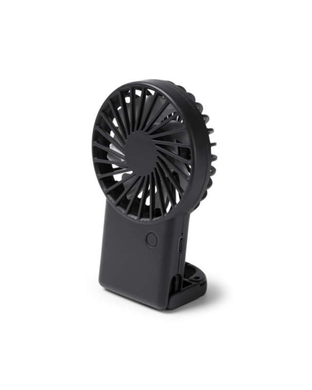 Ventilatore portatile con moschettone e supporto. Tre velocità. Realizzato in ABS riciclato. Include cavo di tipo C. Confezione in scatola con design ecologico - Composizione: ABS riciclato - Misure: 8cm/14,8cm/2,6cm