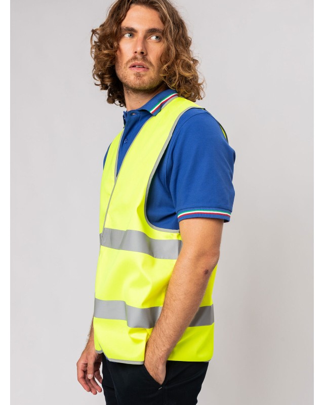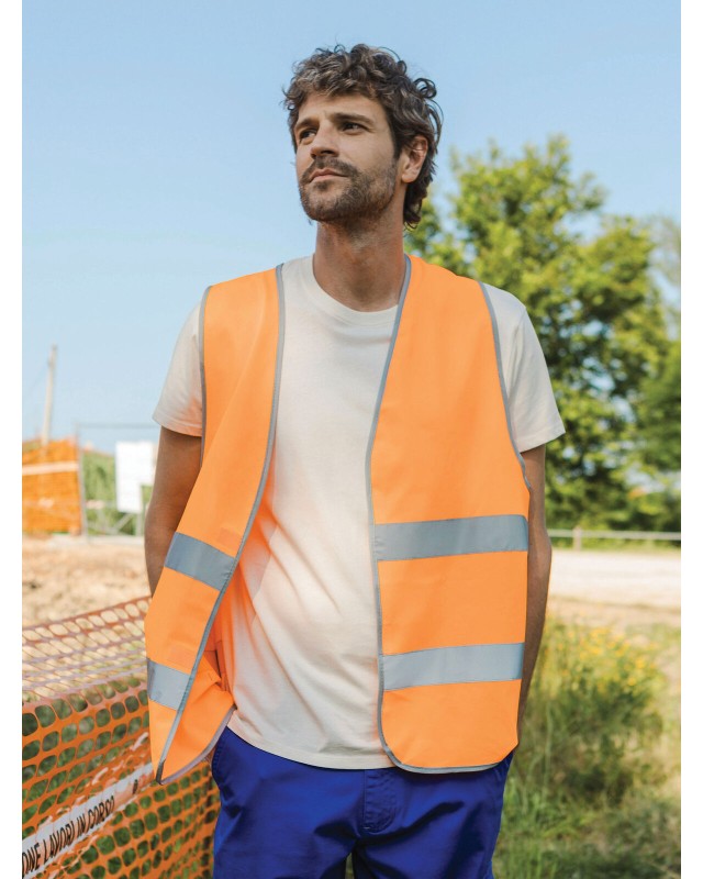 100% poliestere. Gilet alta visibilità. Cuciture di 50 mm sulle fasce riflettenti. Chiusura frontale in Velcro. Da indossare attillato per la massima efficienza. Adatto alla stampa transfer, stampa diretta o ricamo. EN ISO 20471:2013, class 2, conforme a direttiva 89/686/EEC. Etichetta strappabile.