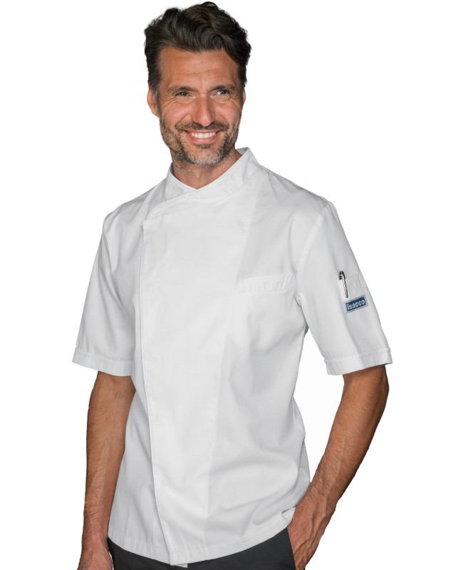 Giacca Cuoco Tokyo bianco slim unisex, taglia XXXL, a mezza manica ha la schiena completamente in rete microfor per garantire un ottima traspirabilità . Ideale come divisa per uomo e donna da chef in cucina, ristorante o catering. Taschino al petto e alla manica con allacciatura con bottoni a pressione Poliestere Cotone Mezza Manica. Peso: 130 Gr/m². Composizione: 65% Poliestere 35% Cotone. Extra Large 3XL