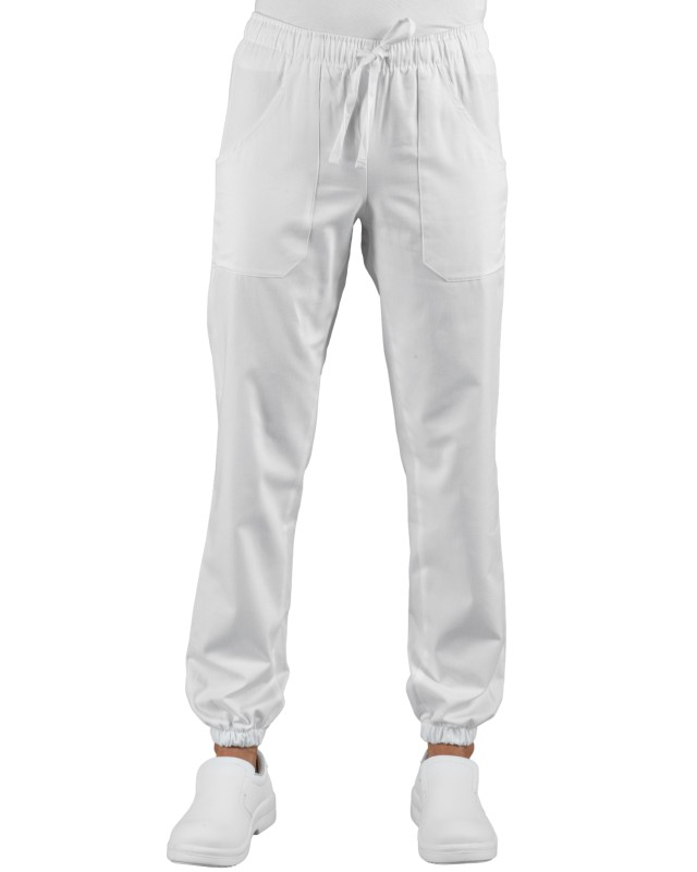 Pantagiaffa unisex con elastico in vita e alle caviglie in tecno stretch bianco. Molto utilizzato nel settore medicale, estetico, sanitario, ospedaliero e alimentare. Come divisa da lavoro medico, infermiere, per aziende di servizi, pulizie e cucina e cuoco. In tessuto traspirante e resistente assicura freschezza e comodità per tutta la giornata Poliestere Spandex. Peso: 145 Gr/m². Composizione: 96% Poliestere 4% Spandex
