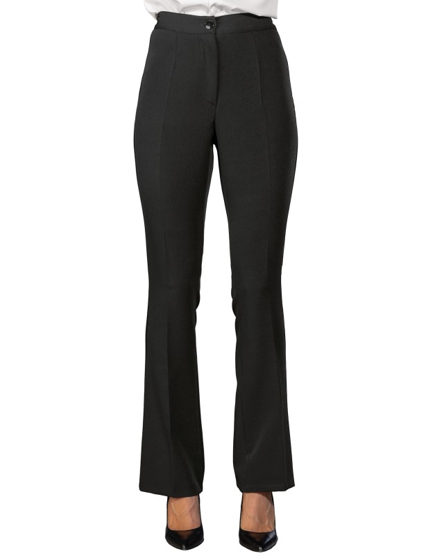 Il pantalone da donna Trendy nero. Per settore alberghiero e servizio in sala. Utilizzata come divisa da lavoro per estetista, per bar, pub, ristoranti, enoteche, catering e per aziende di servizi. Chiusura frontale con zip con bottone, senza tasche. Poliestere Spandex. Peso: 200 Gr/m². Composizione: 96% Poliestere 4% Spandex. Stretch