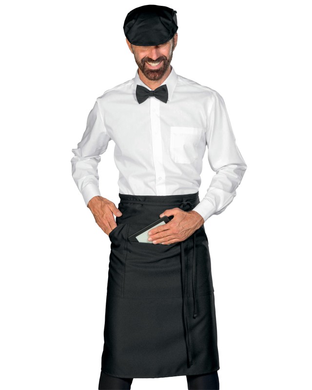 Grembiule Eldorado porta tablet nero. Ideale per settore alberghiero e parannanza per ristorazione da sala(cameriere). Divisa da lavoro per bar, pub, ristoranti, alimentari, cucine, cuoco e catering. Poliestere. Peso: 220 Gr/m². Composizione: 100% Poliestere