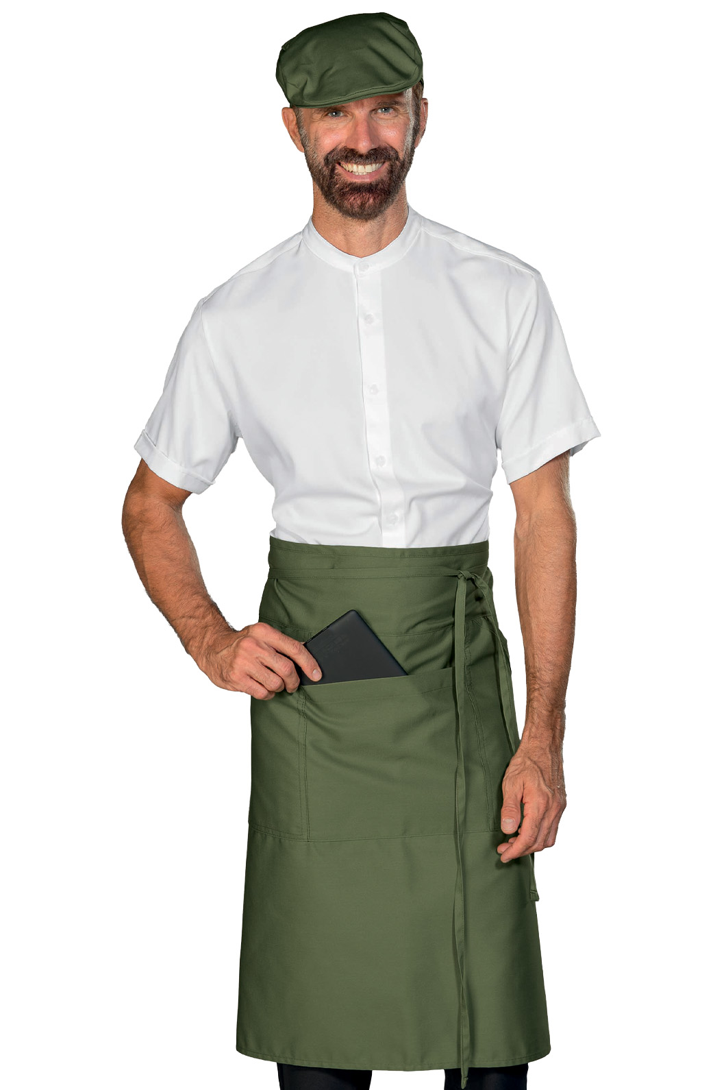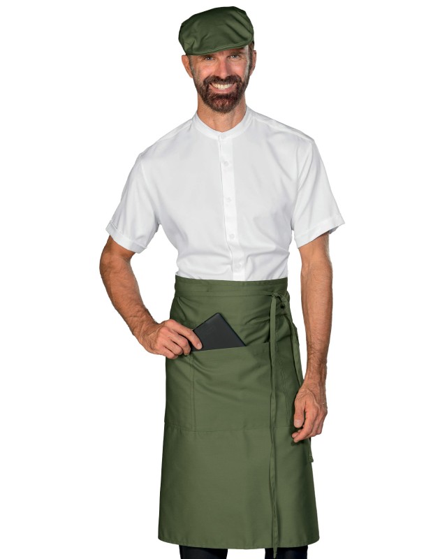 Grembiule da tavola Eldorado verde militare. Con lacci in tessuto lunghi 90 cm. Ideale per il settore alberghiero e della ristorazione (camerieri). Abbigliamento da lavoro per bar, pub, ristoranti, ristorazione, cucine, chef e catering. Grembiule da barista. Poliestere Cotone. Peso: 195 Gr/m². Composizione: 65% Poliestere 35% Cotone - 195 Gr/m²
